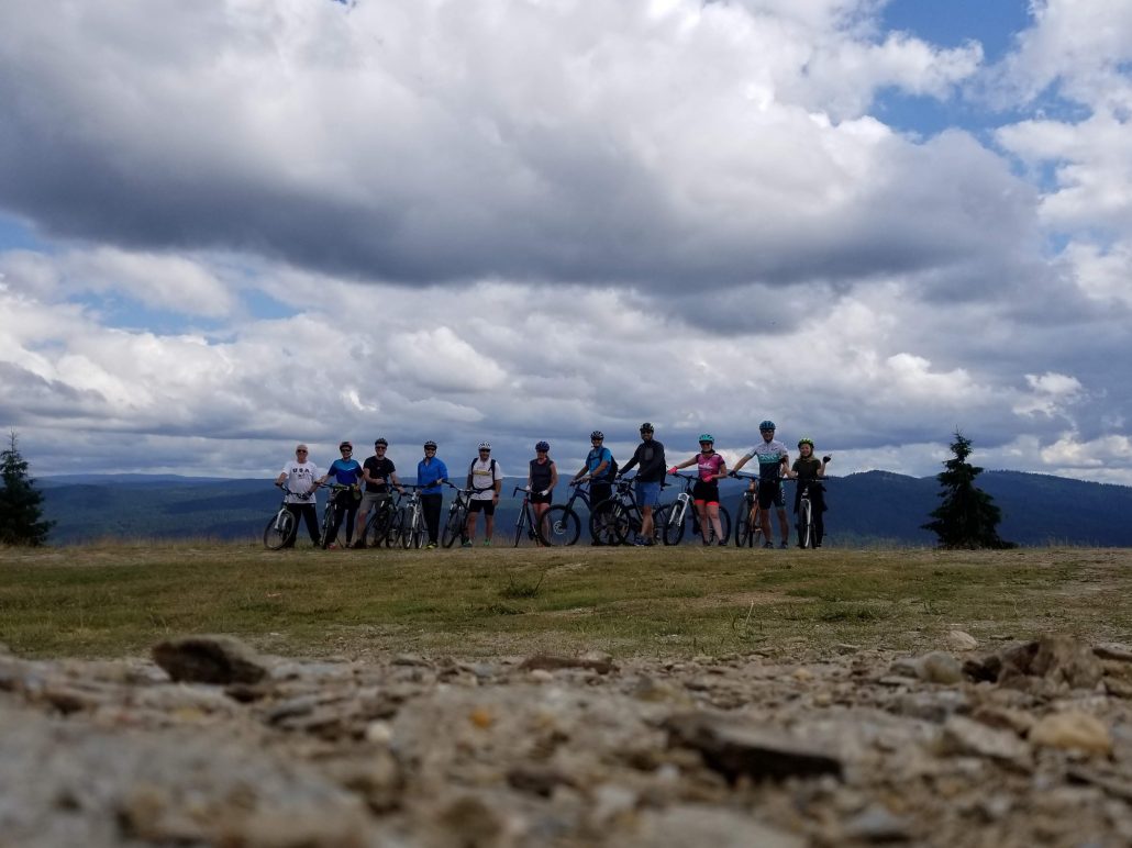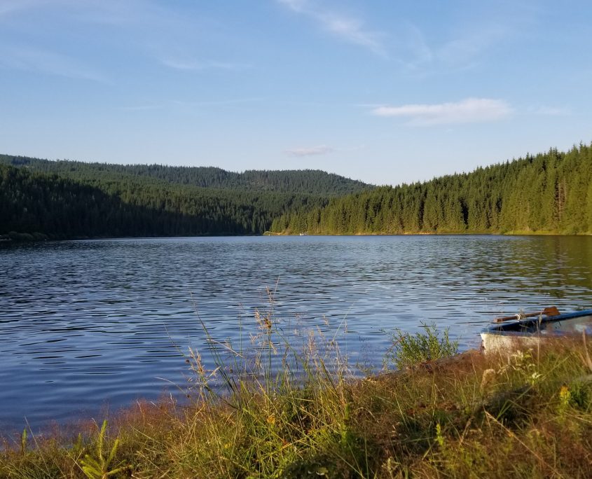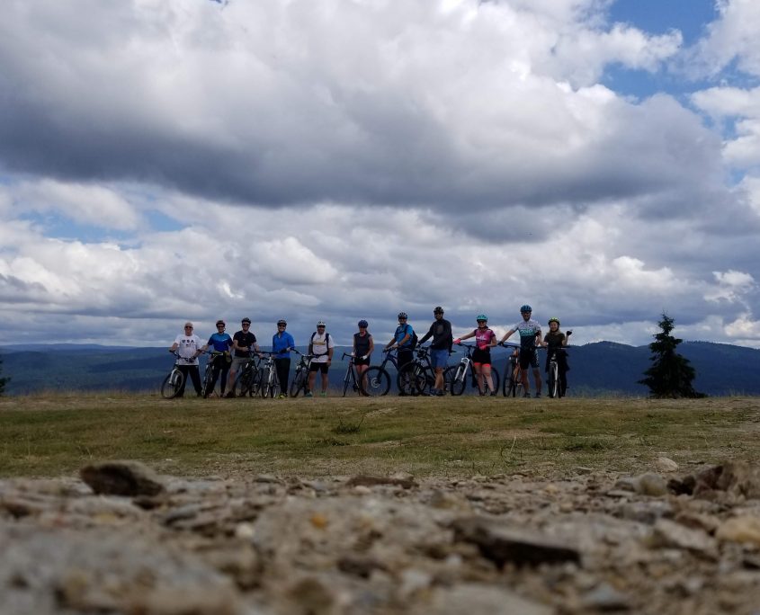 Înviorarea de sâmbătă dimineaţa a început cu o repriză de ploaie răcoroasă de vară, dar asta nu ne-a descurajat. După încă un mic dejun plin de energie am scos bicicletele. Traseul a început printr-o urcare pe un drum pietruit, dar după câţiva kilometri am dat de astfalt. În scurt timp, natura avea să ne lase cu gura căscată: vedeam jos în vale cabana şi lacul, iar în depărtare erau dealuri pline de verdeaţă, copaci şi cabane cochete pe ici-colo. Peisajul cerea o poză de grup, aşa că nu am putut rata momentul şi i-am făcut invidioşi pe cei de acasă cu o fotografie plină de guri până la urechi.