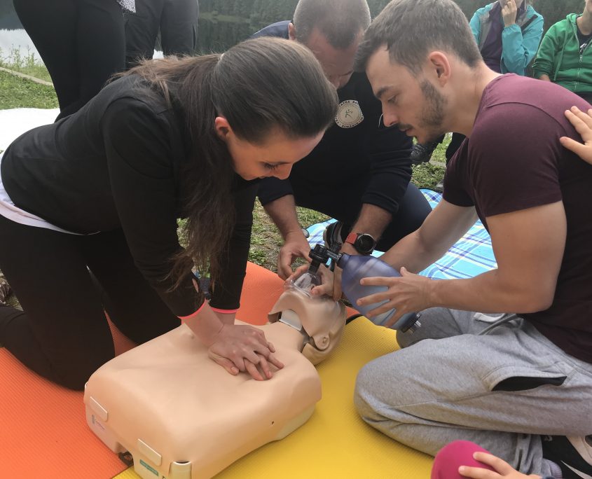 Dimineaţa de duminică s-a dovedit a fi perfectă pentru înviorare. Cerul senin, roua proaspată şi răcoarea specifică zonei de munte ne-au trezit rapid simţurile. Recunosc şi că e posibil să ne fi sărit rapid somnul şi pentru că nici unul dintre noi nu voia să mai plece acasă. În ultima zi a ieşirii, profesorul Pop ne-a provocat la un curs practic de prim-ajutor. În echipe de câte doi, am exersat manevre de resuscitare în caz de înec, dar şi alte proceduri de intervenţie în caz de urgenţă. Am realizat că cei care fac asta zilnic sunt supraoameni.